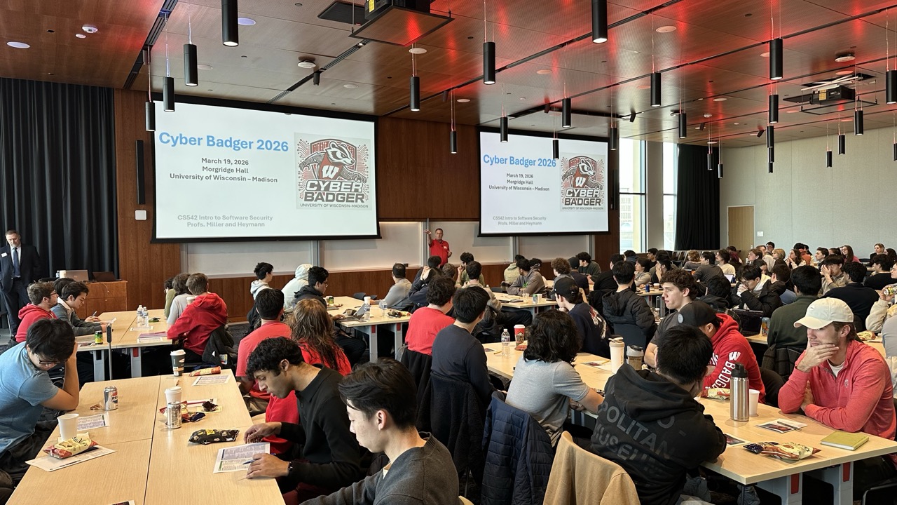 120 students and government and industry partners gather in Morgridge Hall’s WARF Centennial Seminar Room for Cyber Badger 2026.