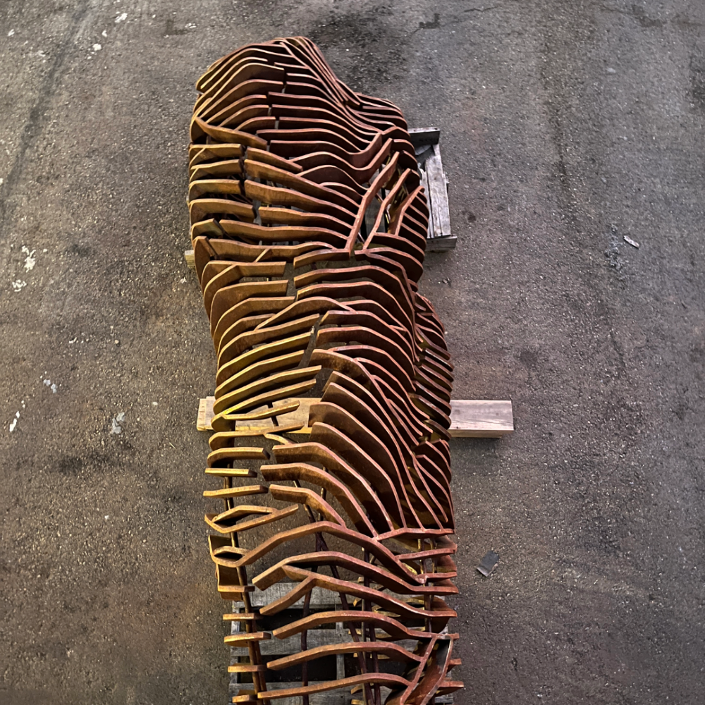 Those clay forms were then 3d scanned and the resulting mesh surface brought into CAD modeling software.  Within the  CAD software I was able to sketch on the scanned surface the pattern of steel bars that defines the volume and texture of the sculptures.  We then used a script that we developed for this project to translate that linework into flat, piecewise planar patterns that were laser cut and bent on a CNC press brake by third party fabricators.  After bending, the pieces were held in place in the studio by plywood jigs that followed the shape of the sculptures and my team and I welded them together.  With all the bent exterior assemblies completed, my assistants and I then welded in the hot bent rods that give the sculptures their vertical support and create the opposing pattern on the inside surface of the forms.  This part of the process was more improvisational, the paths of the vertical bars responding to the shape of the surface that I saw in front of me as each of the pieces neared completion.  The 5 pieces were built one after the other so when drawing the pattern for the exterior elements, I could respond to things that I learned from seeing previous pieces completed.