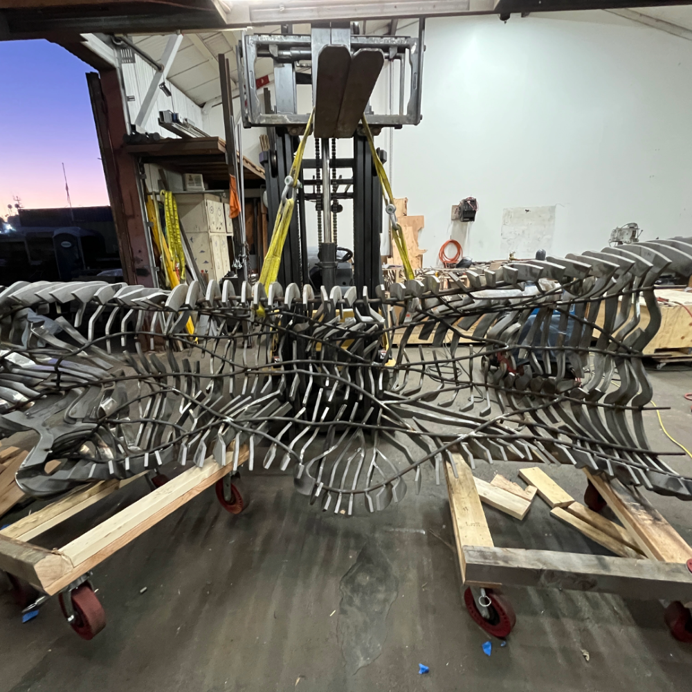 Those clay forms were then 3d scanned and the resulting mesh surface brought into CAD modeling software. Within the CAD software I was able to sketch on the scanned surface the pattern of steel bars that defines the volume and texture of the sculptures. We then used a script that we developed for this project to translate that linework into flat, piecewise planar patterns that were laser cut and bent on a CNC press brake by third party fabricators. After bending, the pieces were held in place in the studio by plywood jigs that followed the shape of the sculptures and my team and I welded them together. With all the bent exterior assemblies completed, my assistants and I then welded in the hot bent rods that give the sculptures their vertical support and create the opposing pattern on the inside surface of the forms. This part of the process was more improvisational, the paths of the vertical bars responding to the shape of the surface that I saw in front of me as each of the pieces neared completion. The 5 pieces were built one after the other so when drawing the pattern for the exterior elements, I could respond to things that I learned from seeing previous pieces completed.
