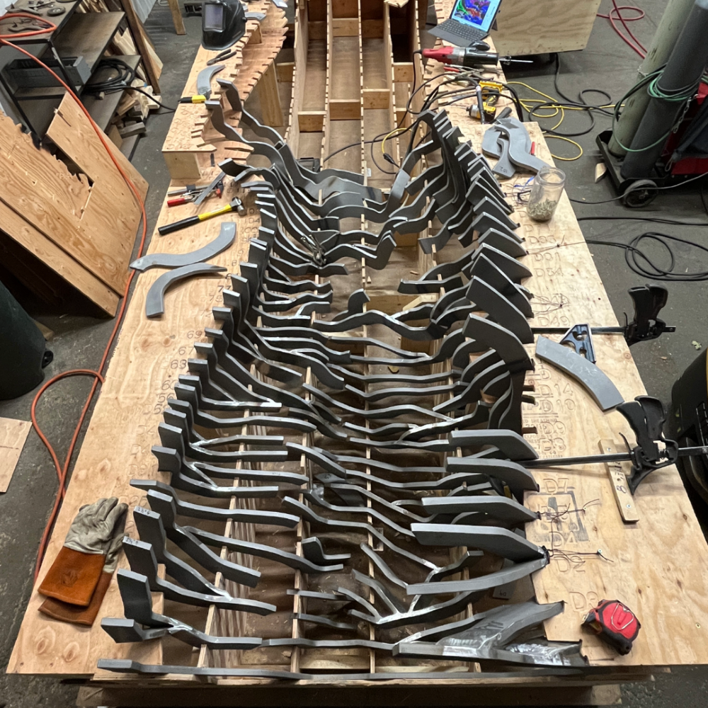 Those clay forms were then 3d scanned and the resulting mesh surface brought into CAD modeling software.  Within the  CAD software I was able to sketch on the scanned surface the pattern of steel bars that defines the volume and texture of the sculptures.  We then used a script that we developed for this project to translate that linework into flat, piecewise planar patterns that were laser cut and bent on a CNC press brake by third party fabricators.  After bending, the pieces were held in place in the studio by plywood jigs that followed the shape of the sculptures and my team and I welded them together.  With all the bent exterior assemblies completed, my assistants and I then welded in the hot bent rods that give the sculptures their vertical support and create the opposing pattern on the inside surface of the forms.  This part of the process was more improvisational, the paths of the vertical bars responding to the shape of the surface that I saw in front of me as each of the pieces neared completion.  The 5 pieces were built one after the other so when drawing the pattern for the exterior elements, I could respond to things that I learned from seeing previous pieces completed.