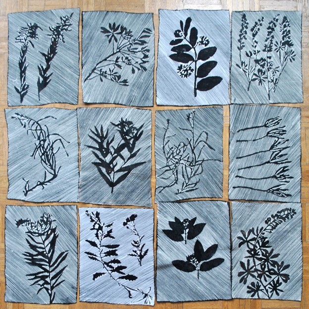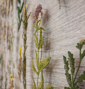 Prairie Plant Studies is a 25-foot wide installation of embroidered pieces pinned to the wall near the Orchard Street entrance of Morgridge Hall, across from Hello World Auditorium.
