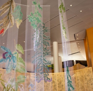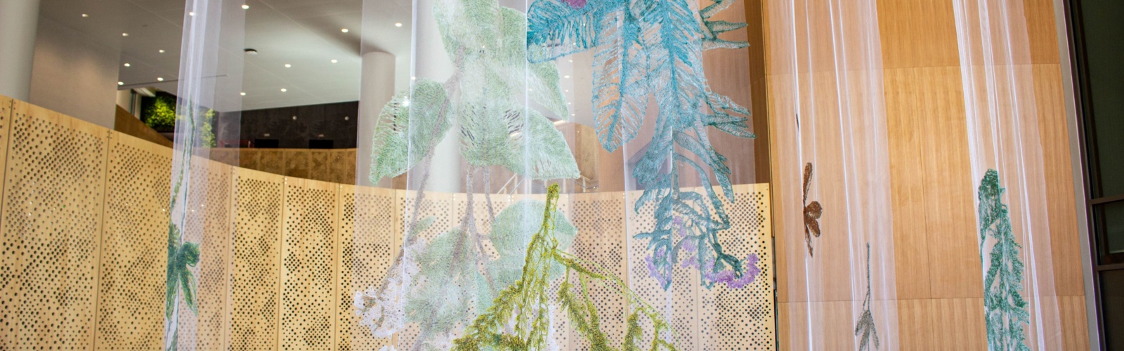 McCavour’s site-specific installation for the CDIS building reimagines interior space as a field of botanical forms, blending scientific documentation with imaginative interpretation. The work explores plants as markers of memory and place, referencing indigenous species while creating new relationships within the contemporary architectural environment.