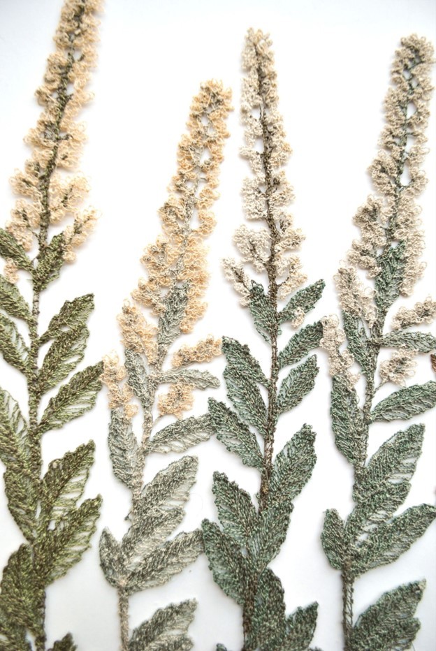 Prairie Plant Studies is a 25-foot wide installation of embroidered pieces pinned to the wall near the Orchard Street entrance of Morgridge Hall, across from Hello World Auditorium.