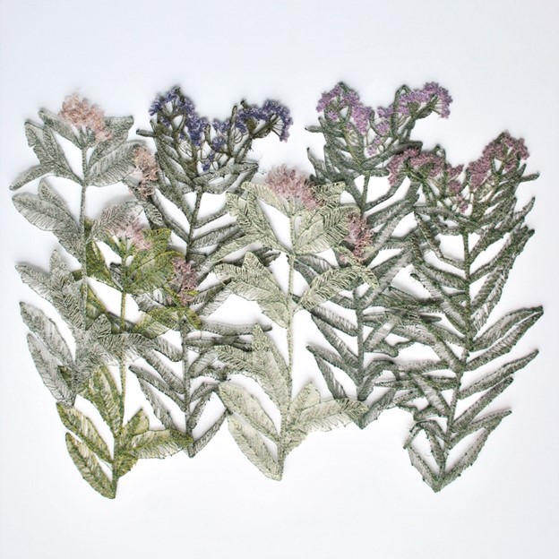 This wall of embroideries is based on pressed flowers indigenous to the Wisconsin Prairie that McCavour studied at the Wisconsin State Herbarium. The work demonstrates her interest in finding connections between scientific research and decorative patterns found in textiles and wallpaper. These pieces are made by sewing into fabric that dissolves in water. Prior to dissolving, she builds up stitched lines and crossing threads. When the fabric is dissolved, the thread drawings interlock together even without a base. This technique creates a powerful connection to plant ecologies, which are similarly linked—biological networks that form bound systems sustaining entire plant communities.