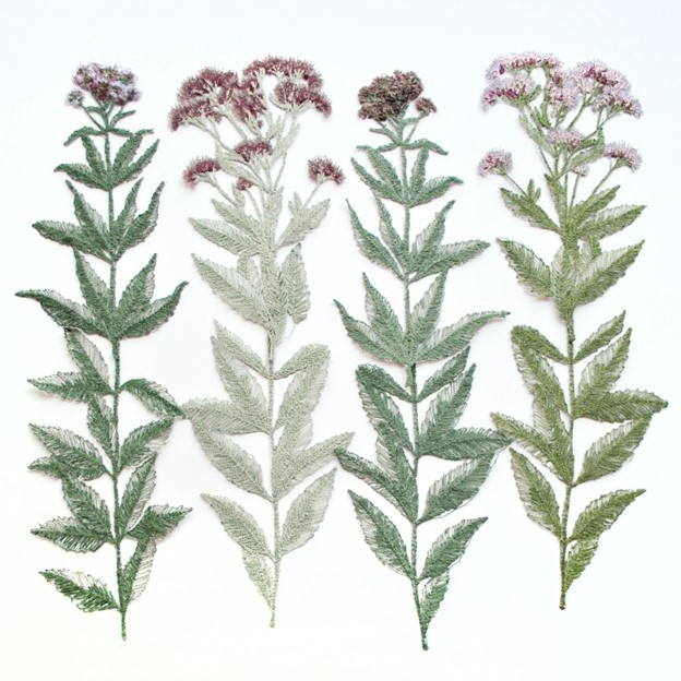 This wall of embroideries is based on pressed flowers indigenous to the Wisconsin Prairie that McCavour studied at the Wisconsin State Herbarium. The work demonstrates her interest in finding connections between scientific research and decorative patterns found in textiles and wallpaper. These pieces are made by sewing into fabric that dissolves in water. Prior to dissolving, she builds up stitched lines and crossing threads. When the fabric is dissolved, the thread drawings interlock together even without a base. This technique creates a powerful connection to plant ecologies, which are similarly linked—biological networks that form bound systems sustaining entire plant communities.