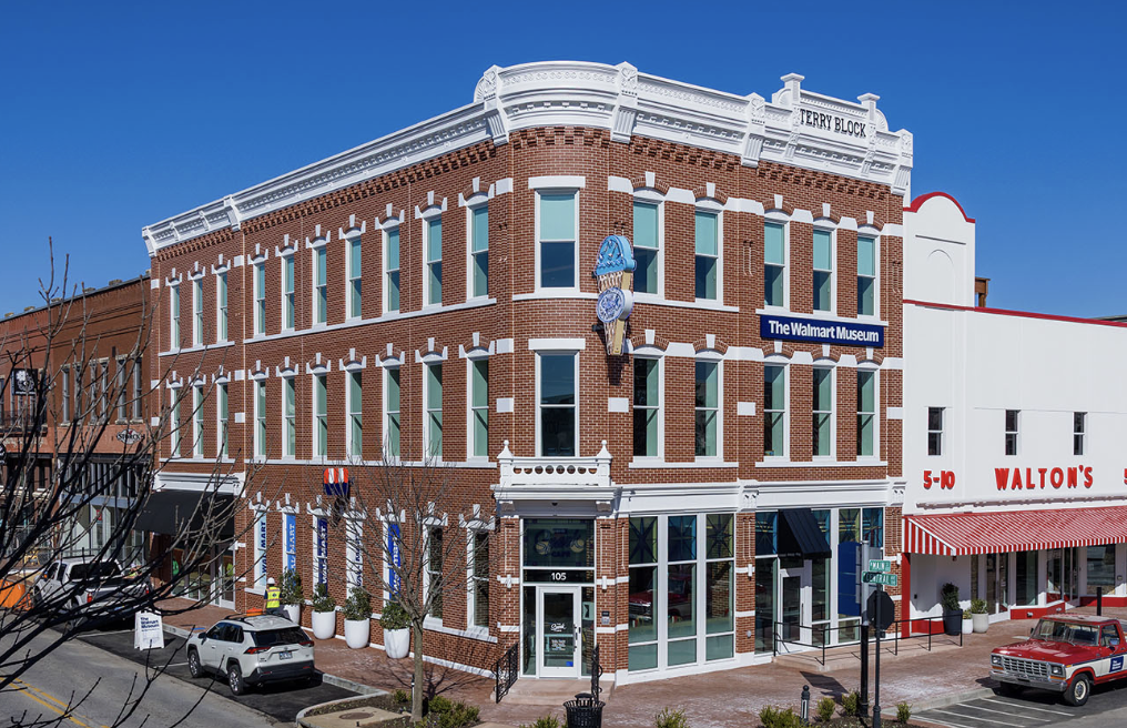 The Walmart Museum and, to the right, Sam Walton’s first store. Willis notes, “Bentonville is beautiful, and it’s a super-friendly community. If you are ever Downtown, everyone likes to get ice-cream at the Spark Café beside the Walmart Museum.” Photo Credit: Walmart Inc.