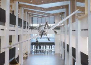 Spanning over 200,000 sq ft, Sam Walton Hall at Walmart’s Home Office features a two-story auditorium, learning and collaboration spaces, and art installations and historical artifacts, including Sam Walton’s first aircraft, a 1946 Ercoupe. Photo Credit: Walmart Inc.